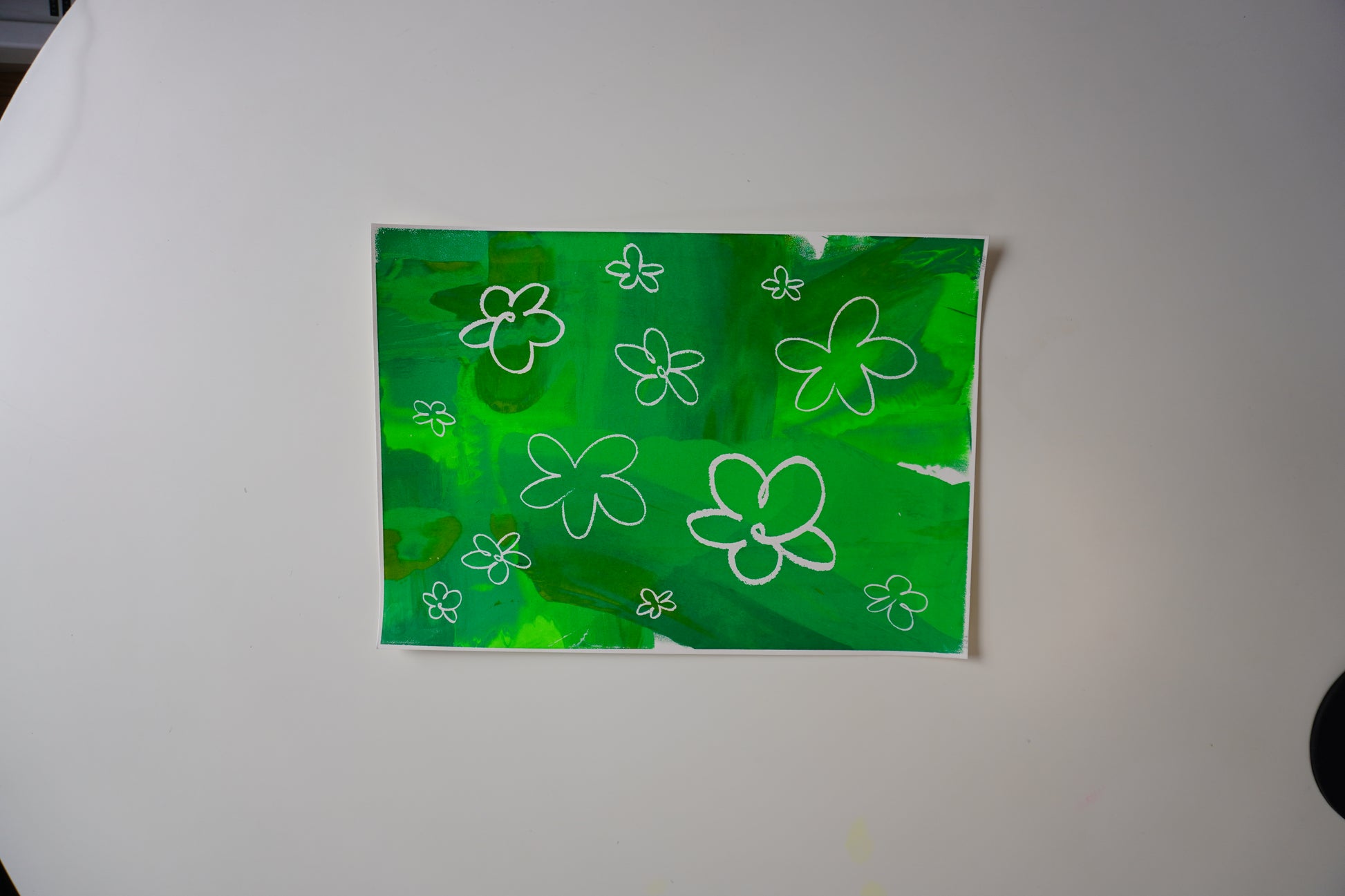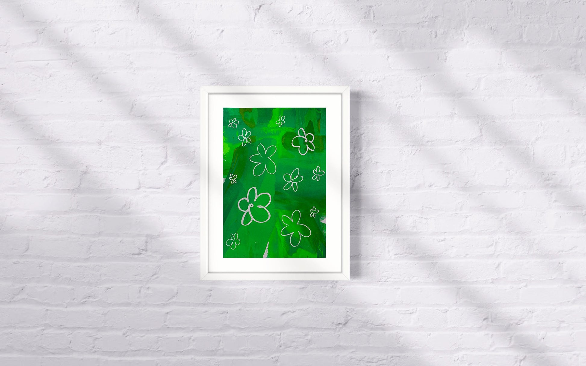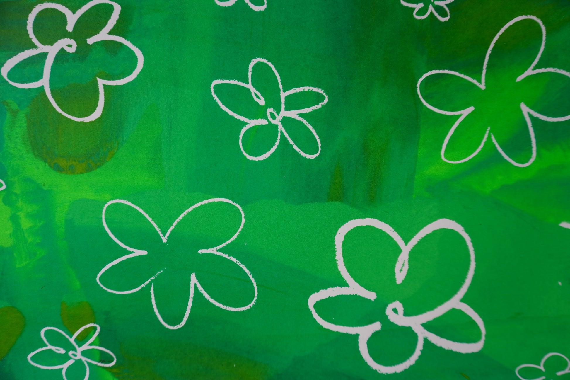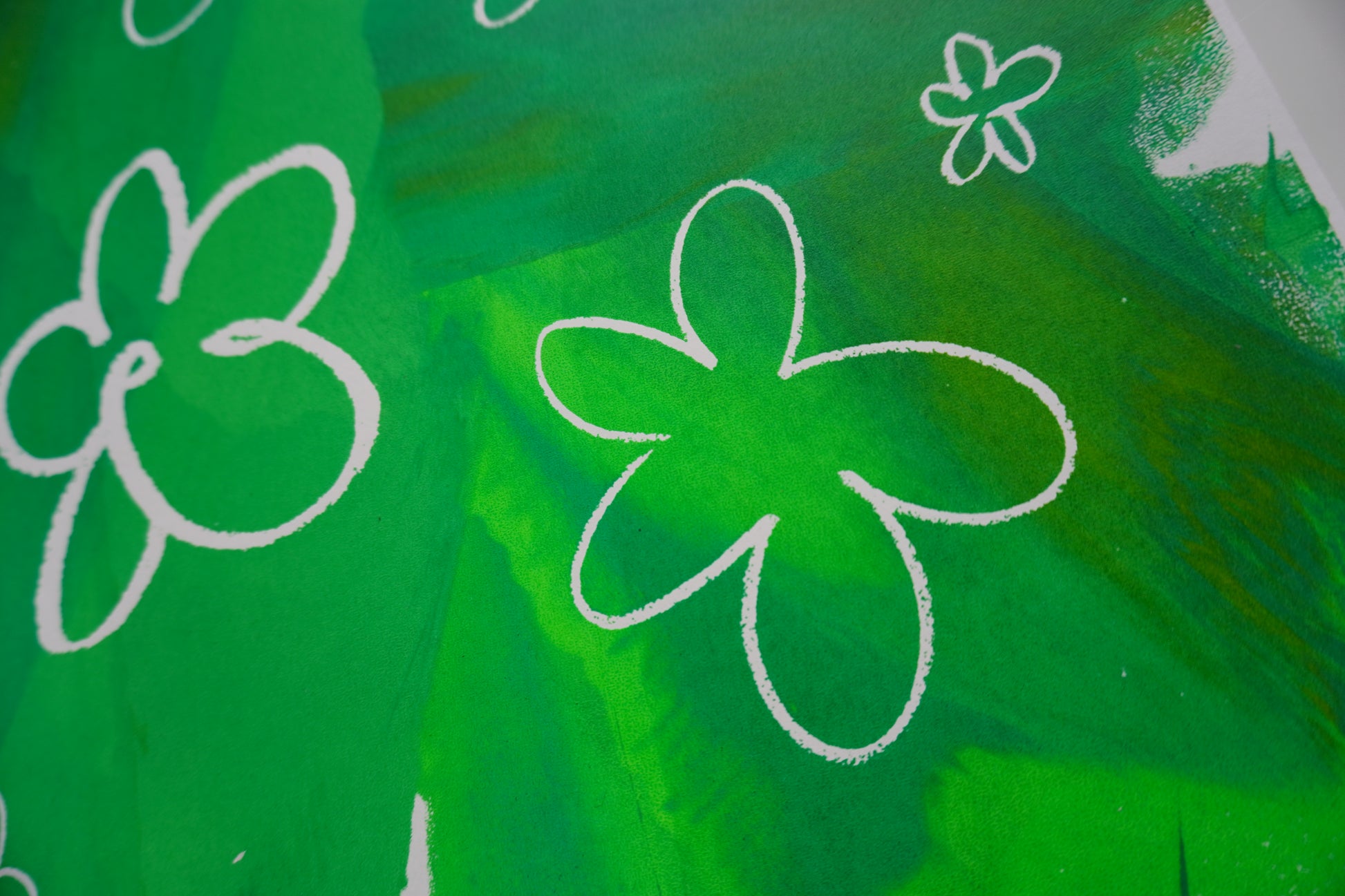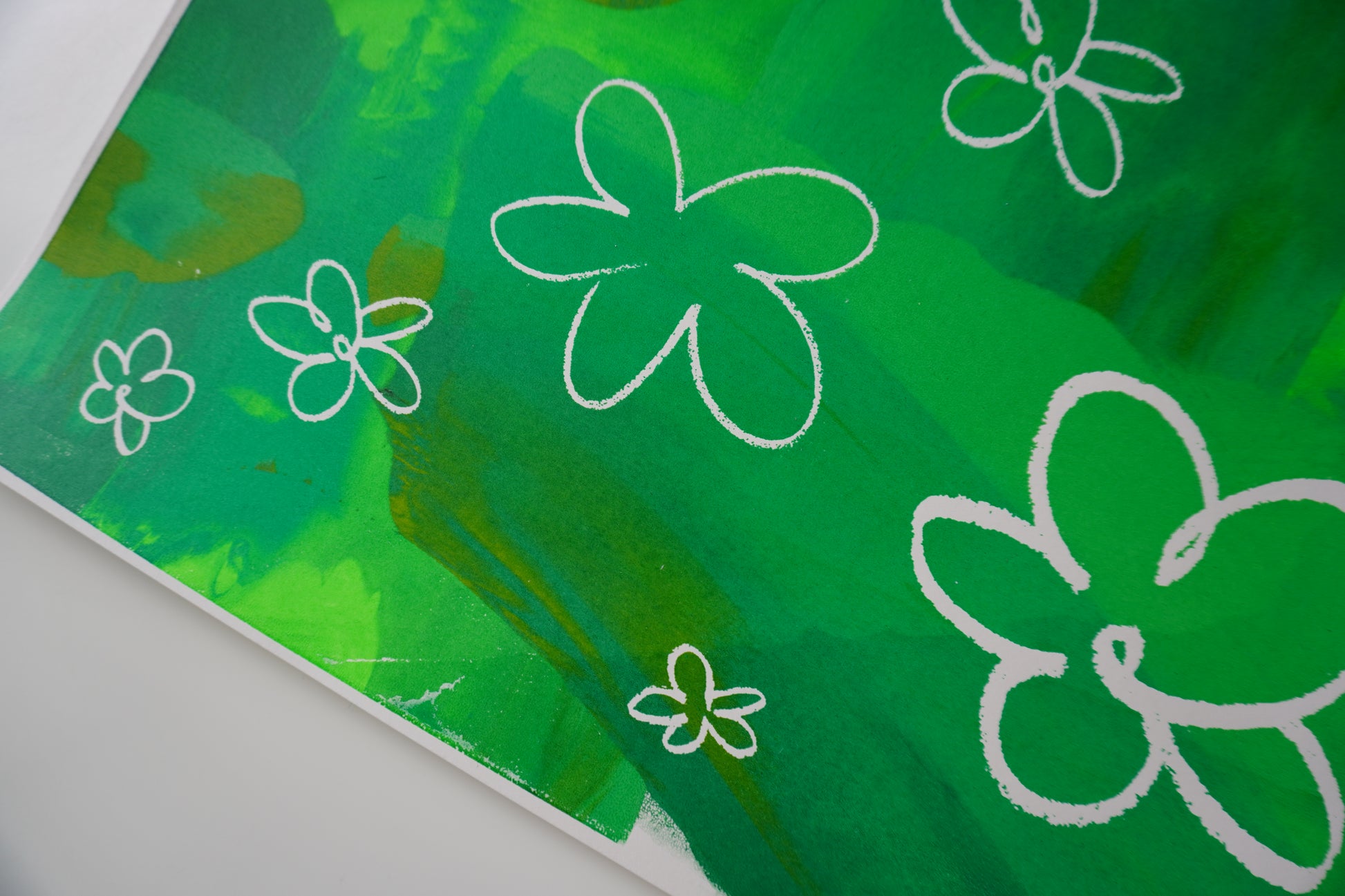 Unique print with hand drawn flowers, free hand printing the negative creating a feeling of movement and flow which makes unique lines and patterns, in a bright green colour way. Each piece is hand made and printed in London.