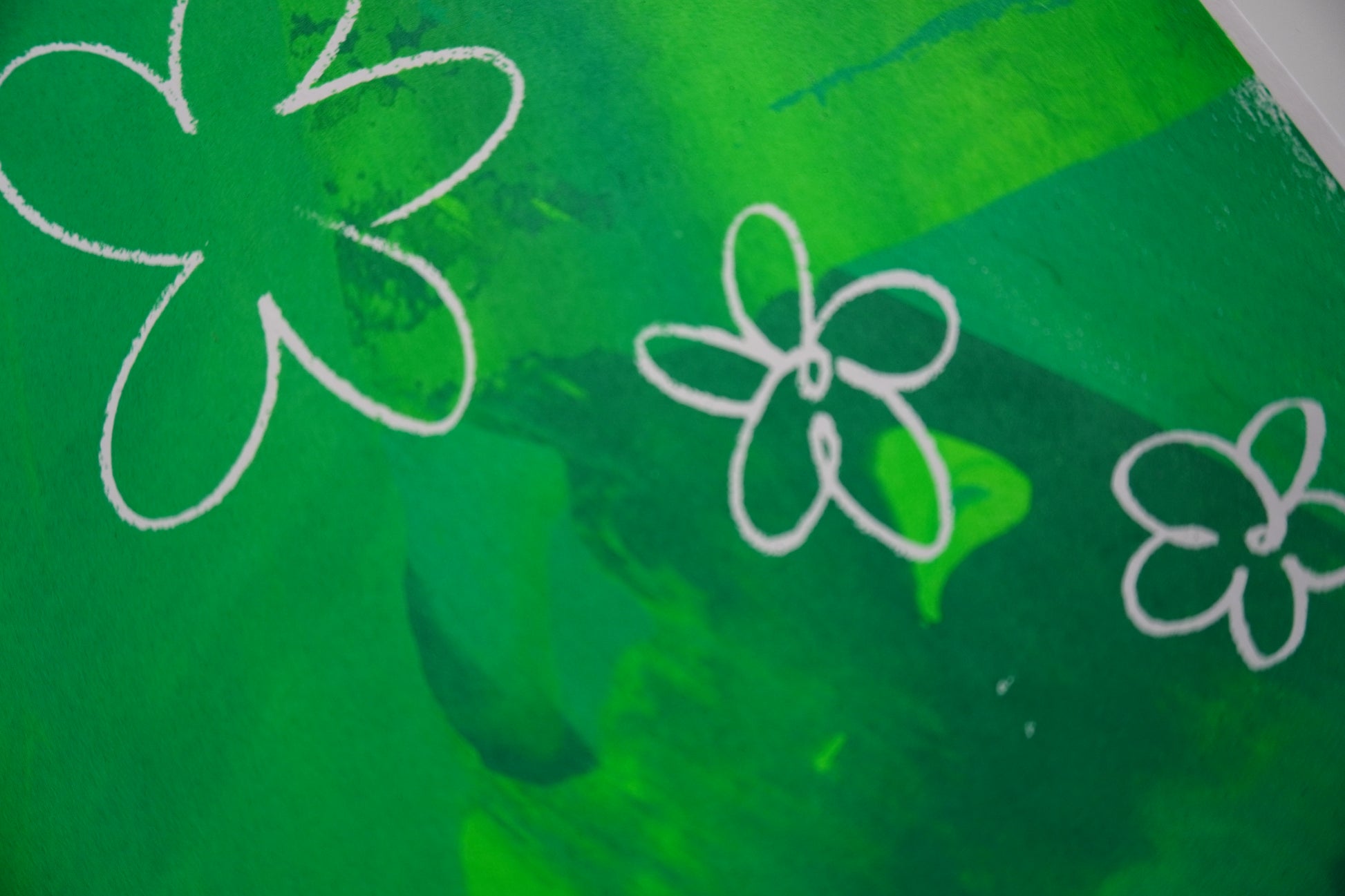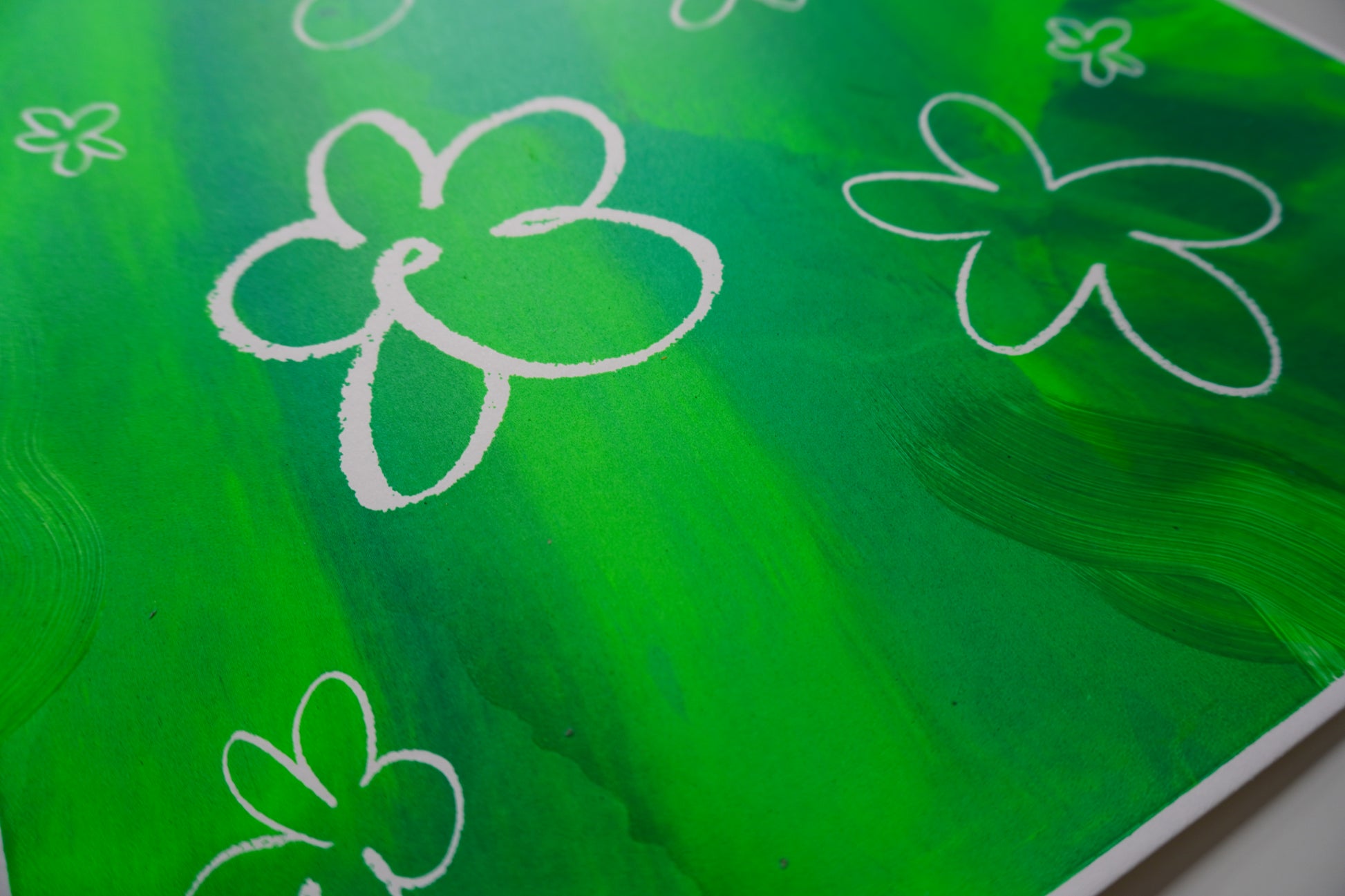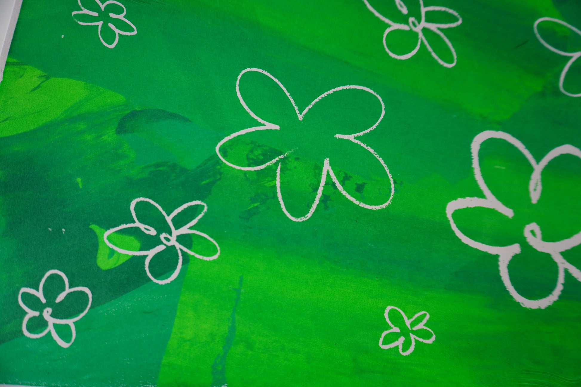 Unique print with hand drawn flowers, free hand printing the negative creating a feeling of movement and flow which makes unique lines and patterns, in a bright green colour way. Each piece is hand made and printed in London.